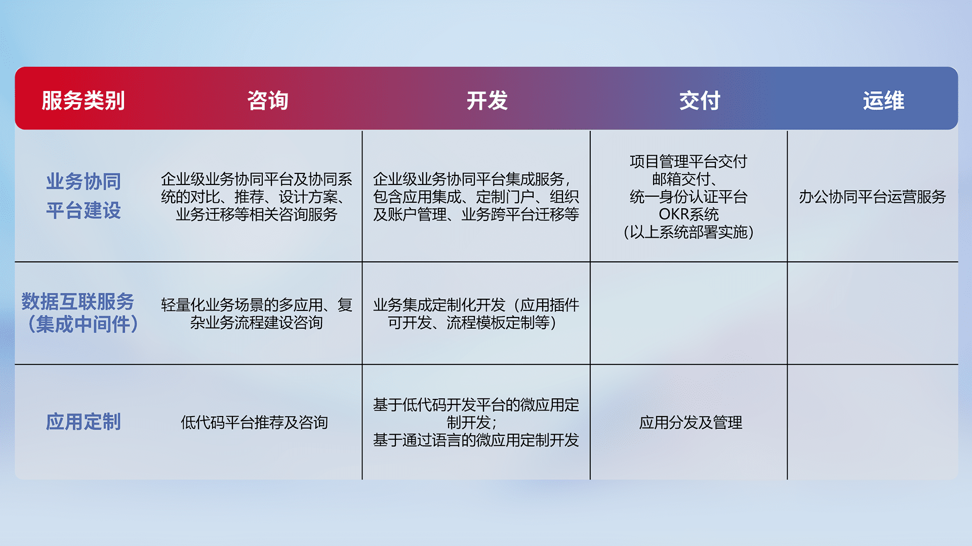 针对钉钉、、企微、、、IDaas等平台级产品提供产品的规划、、、方案、、、交付、、、、定制化开发等服务,,实现如统一协同办公、、、智能客户服务、、混合会议管理、、、、智能数据查询、、、等业务场景,,,,实现数字化转型。。。。
